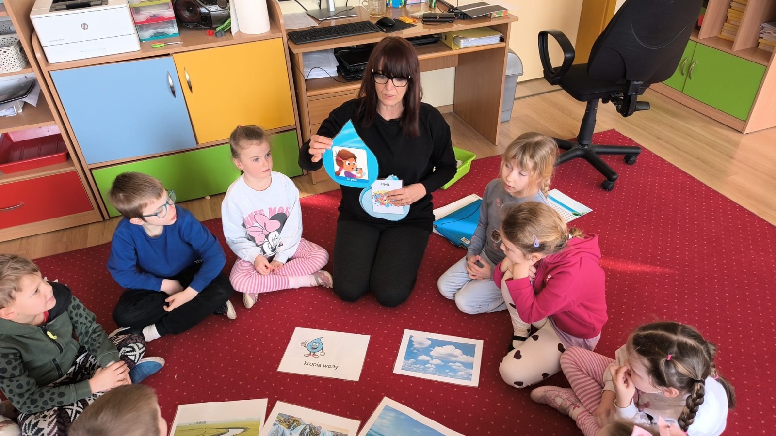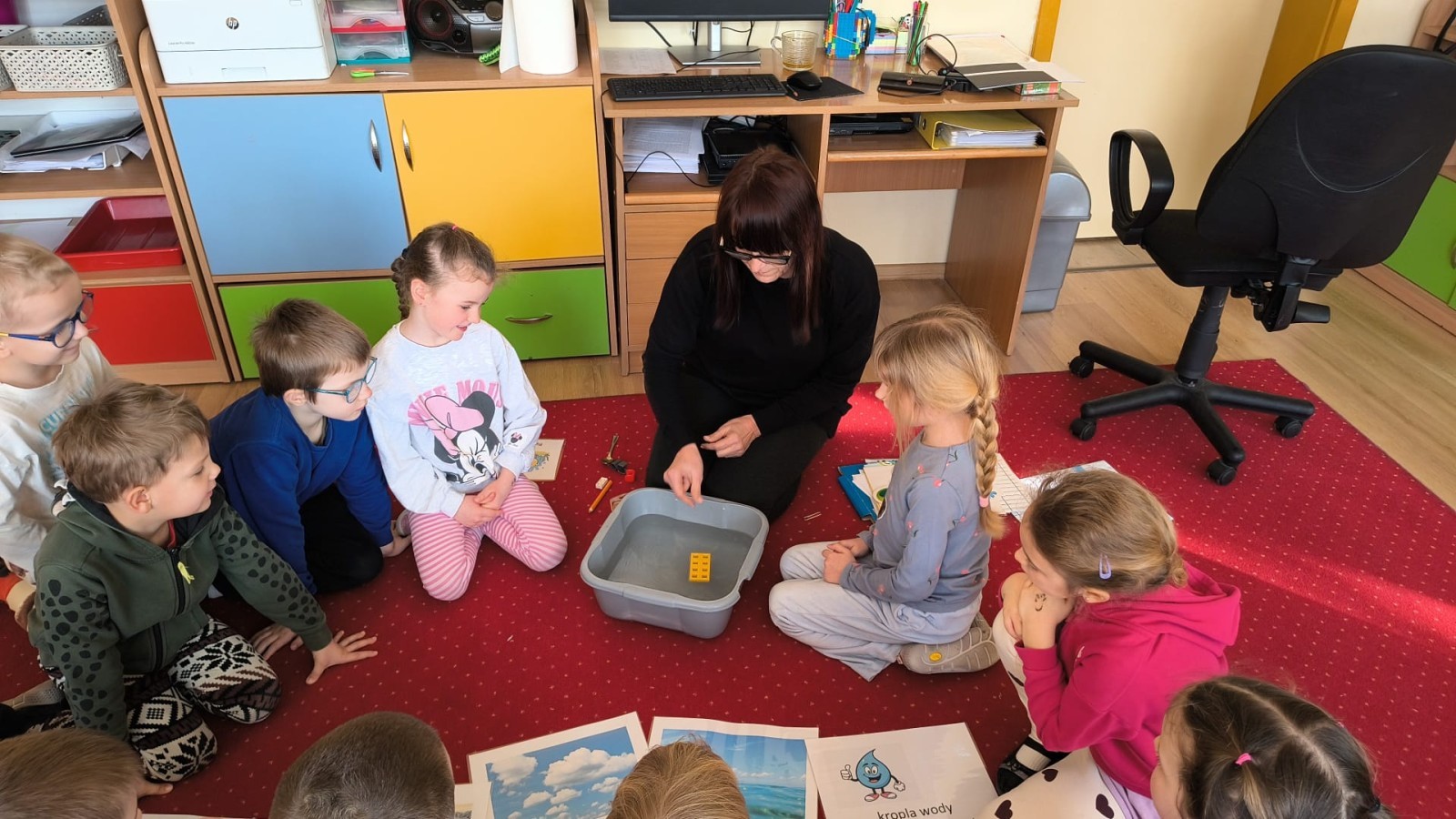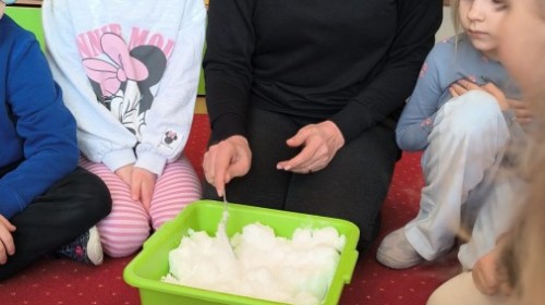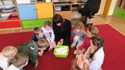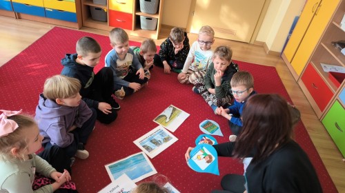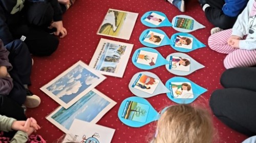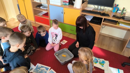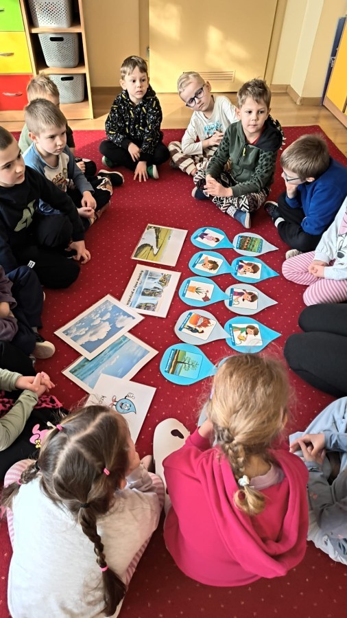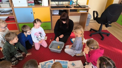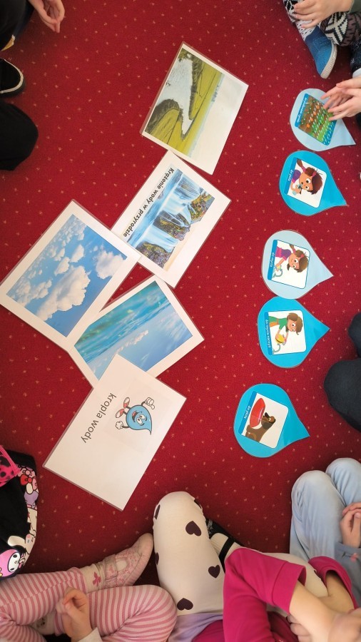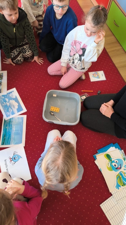 Działanie informacyjne: Podczas zajęć dzieci z przedszkola poznawały właściwości wody oraz jej znaczenie w przyrodzie. Rozmawiały o stanach skupienia wody – cieczy, lodzie i parze wodnej – oraz o tym, jak wygląda jej wędrówka w przyrodzie (obieg wody). Przedszkolaki dowiedziały się, że woda może zmieniać swój stan pod wpływem temperatury oraz że krąży między chmurami, ziemią i zbiornikami wodnymi. Najwięcej radości sprawiły dzieciom doświadczenia. Sprawdzały, które przedmioty toną, a które unoszą się na wodzie, poznając zjawisko wyporu. Obserwowały także, że po włożeniu różnych przedmiotów poziom wody się podnosi, co pozwoliło im zrozumieć pojęcie objętości. Zajęcia miały charakter badawczy i rozwijały ciekawość oraz umiejętność wyciągania wniosków z obserwacji. Obejrzeliśmy także film edukacyjny udostępniony przez przedsiębiorstwo Aqua ”Czego nie wrzucać do kanalizacji?”.
