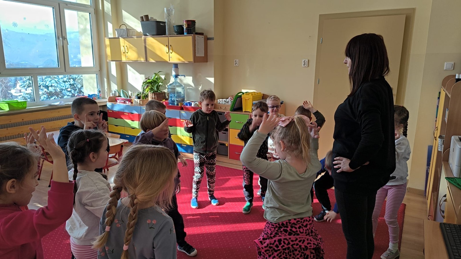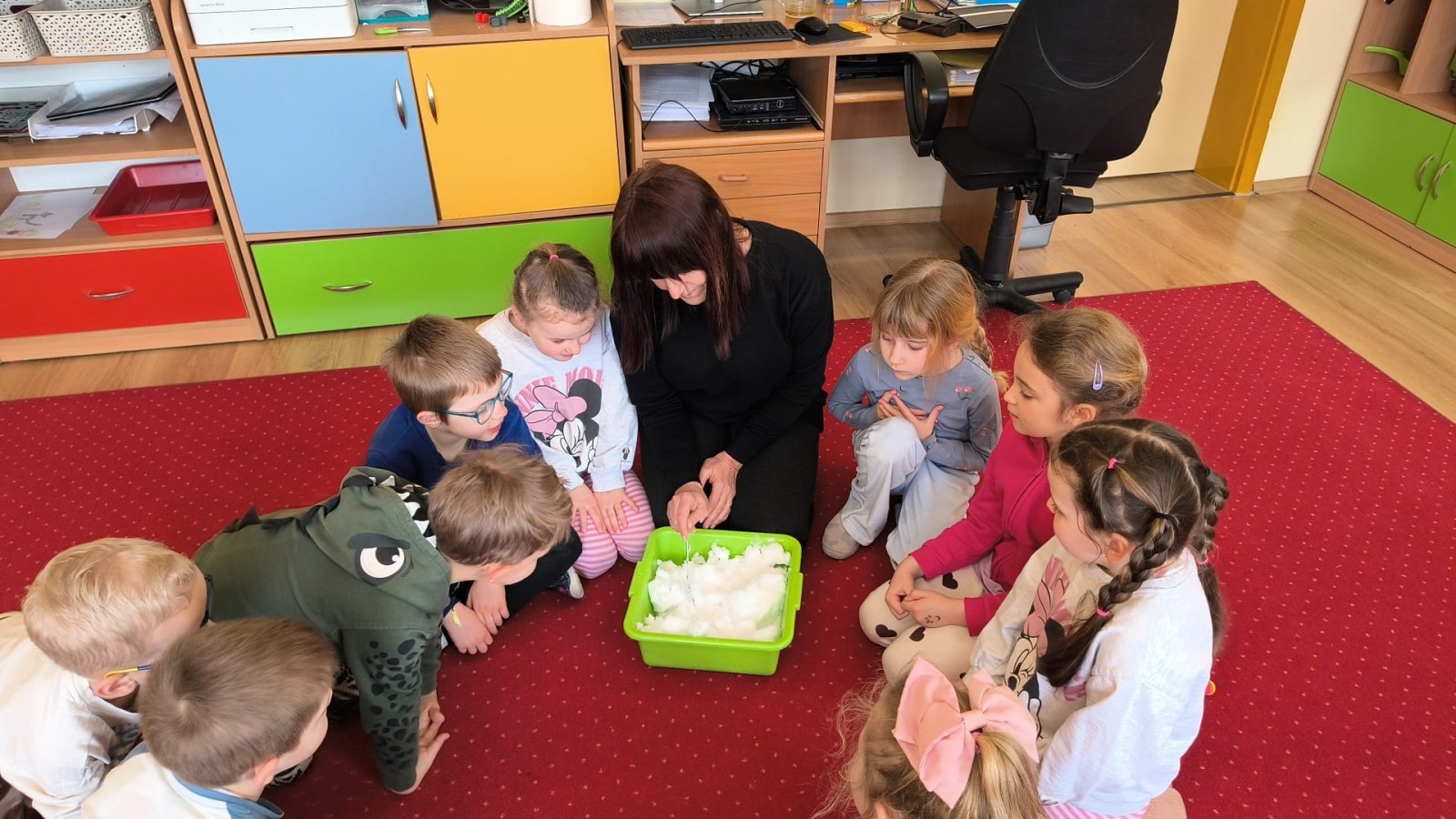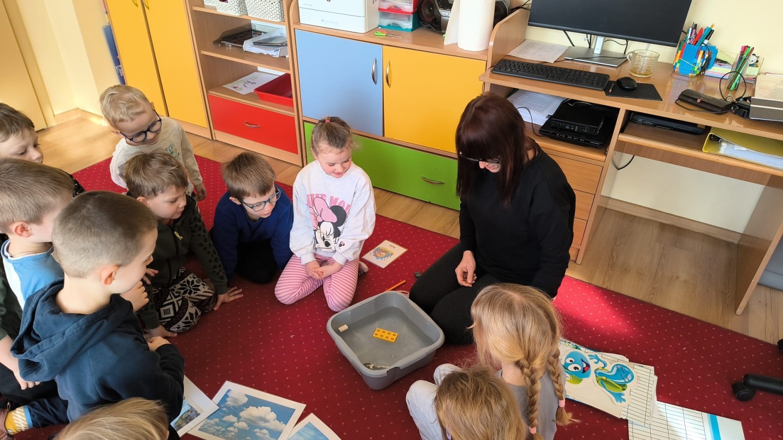 Działanie informacyjne: Podczas zajęć dzieci z przedszkola poznawały właściwości wody oraz jej znaczenie w przyrodzie. Rozmawiały o stanach skupienia wody – cieczy, lodzie i parze wodnej – oraz o tym, jak wygląda jej wędrówka w przyrodzie (obieg wody). Przedszkolaki dowiedziały się, że woda może zmieniać swój stan pod wpływem temperatury oraz że krąży między chmurami, ziemią i zbiornikami wodnymi. Najwięcej radości sprawiły dzieciom doświadczenia. Sprawdzały, które przedmioty toną, a które unoszą się na wodzie, poznając zjawisko wyporu. Obserwowały także, że po włożeniu różnych przedmiotów poziom wody się podnosi, co pozwoliło im zrozumieć pojęcie objętości. Zajęcia miały charakter badawczy i rozwijały ciekawość oraz umiejętność wyciągania wniosków z obserwacji. Obejrzeliśmy także film edukacyjny udostępniony przez przedsiębiorstwo Aqua ”Czego nie wrzucać do kanalizacji?”.