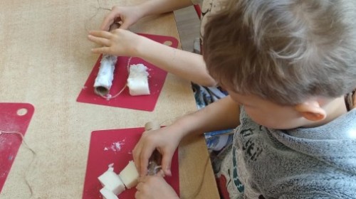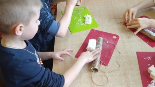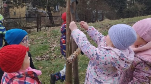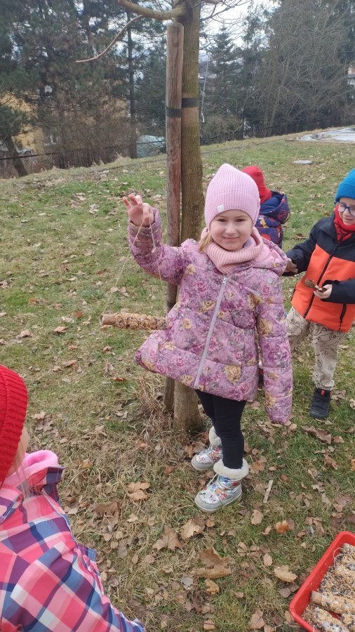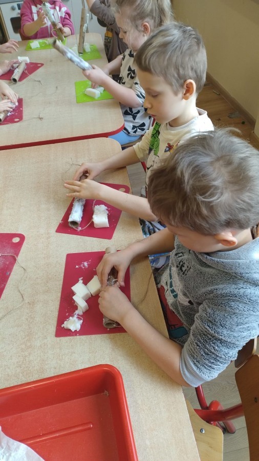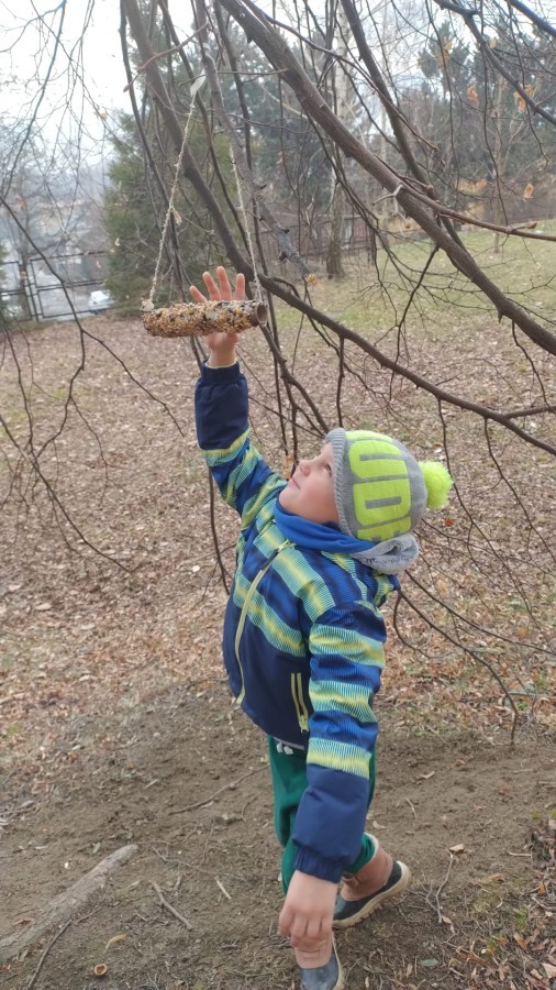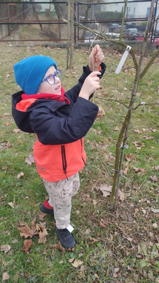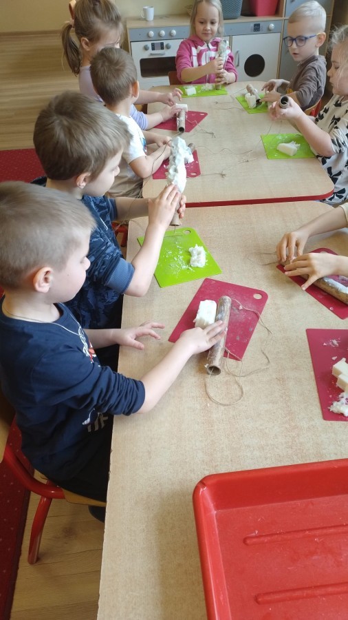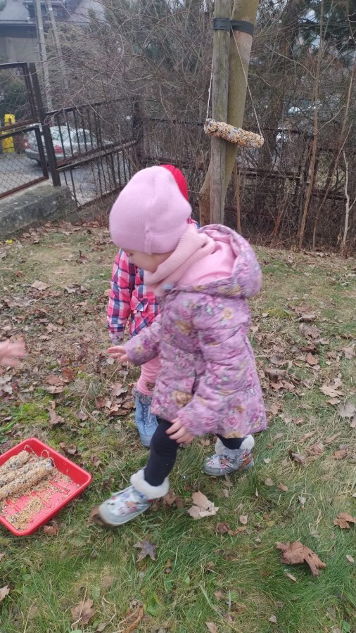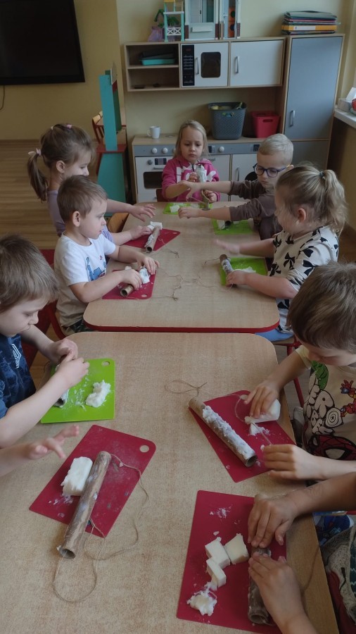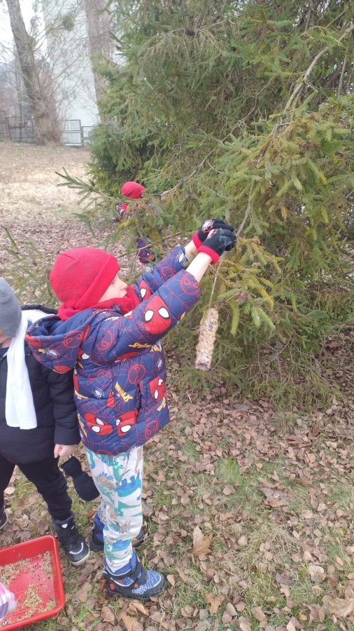 Zima w tym roku była wyjątkowo mroźna , co również odczuwają zwierzęta i ptaki. Dzieci z grupy starszaków wzięły udział w działaniu pt. „Pomagamy ptakom zimą”. Podczas zajęć przygotowały jadalne zawieszki z ziaren i smalcu, które następnie powiesiły w ogrodzie przedszkolnym. Celem przedsięwzięcia było wsparcie ptaków w trudnym, zimowym okresie, kiedy dostęp do pożywienia jest ograniczony. Działanie to sprzyjało rozwijaniu u dzieci postawy opiekuńczej, wrażliwości na potrzeby zwierząt oraz odpowiedzialności za środowisko przyrodnicze. Dodatkowo dzieci miały możliwość obserwowania ptaków odwiedzających karmniki, co wzbogaciło ich wiedzę przyrodniczą i dostarczyło wielu pozytywnych emocji.